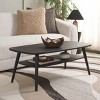 Uplift any corner with the modern charm and rustic appeal of our Karou coffee table. Our mid-century-inspired coffee table enlivens your space with its effortless style and warm elevating tone. Its rectangular tabletop is finished off with rounded edges to attain a soft and inviting look. Tapered legs complete the sleek and modern profile of the coffee table. It showcases the organic grains of wood in a black finish. Our coffee table includes a lower shelf to provide ample space for both display and storage.