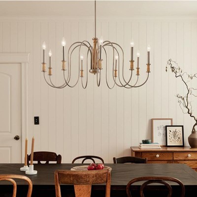 [This review was collected as part of a promotion.] I'm absolutely in love with my Kichler Karthe 9 light chandelier with brushed nickel and beechwood. It's very light and easy to assemble. Just follow the easy to read instructions. It's also easy to install. It's beautiful and hanging above my kitchen table. You can put what lightbulbs you want in it, either bright or dinner ones. With 9 light sockets to use it keeps the room pretty bright. It's brushed nickel and beechwood give it a lovely classic look which matches so many decors. It's really beautiful.