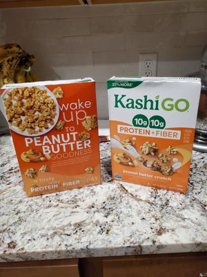 - Level up your day with Kashi GO Peanut Butter Crunch breakfast cereal; Enjoy a sweet and crispy combo of plant protein and peanut butter clusters