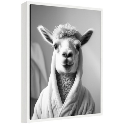 A llama with a towel on its head is sitting in a bubble-filled bathtub. The background is a pink floral wallpaper, and the scene is surrounded by various potted plants and cacti. It creates a playful and whimsical atmosphere. This Kate and Laurel canvas art print was created by Honey Island Studio and printed by Kate and Laurel in Waunakee WI. This modern floating canvas art is sure to bring joy to your space. Our design team curates art that will fit perfectly in any room of your home. Showcase this art in your living room, bedroom, home office, kitchen, bathroom, nursery, or anywhere you want to bring a little beauty and charm to your walls. Specializing in home decor, we are continually bringing timeless works of art for the traditional decorator as well as trend-forward pieces for that eclectic art lover. Our high-quality framed canvas art also makes excellent gifts for birthdays, holidays, or housewarming parties. Printed on gallery-wrapped canvas and framed with a simple gallery frame this wall art is easy to display on the wall and will match with any decor style. The outside display dimensions are 18 in. w x 24 in. h by 1.6 in. Print Name: "Maximalist Llama Bath"