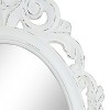 Introducing the Kate and Laurel Pietra oval wall mirror, a stunning addition to any home decor. With its ornate carved detailing, it adds a touch of elegance and charm to your space. Crafted with care, the Pietra mirror features a durable frame that showcases intricate designs. The ornate carvings along the frame bring a vintage feel to your room, creating a timeless accent. The soft white color complements various interior styles, making it versatile and easy to incorporate into any room's aesthetic. The oval shape provides a taller viewing angle than a round mirror of this size, allowing you to see a larger portion of your reflection. Whether you're applying makeup or styling your hair, this mirror ensures you have a clear view. The Pietra mirror is designed for easy installation. It comes with an attached metal D-ring hanger, making it a hassle-free addition to your wall. Hang it securely in your powder room, bedroom, or hallway, and instantly transform your space. Measuring 20 inches wide by 31.5 inches high, this white, soft vintage mirror is perfect for your small powder room vanity.