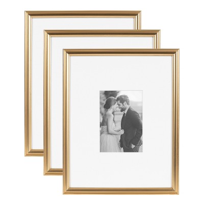 Add a trio of stunning picture frames to your wall decor with this photo frame set from Kate and Laurel. Each frame also features an easel to feature them as tabletop frames on your entryway console table or your living room coffee table. Crafted to meld well with a variety of decor styles, this picture frame set features an antique gold finish. The gallery wall set includes two different rectangular frames and a delightful arched picture frame. Their cohesive look allows you to showcase them together as a trio or spread out throughout your gallery wall or the rest of your home. Separating itself from a standard frame set, this frame trio includes vintage detailing along the frames to further accentuate your photographs. Both of the rectangle frames can be hung vertically or horizontally based on your preference or available wall space. The arched frame resembles the crown of our popular Arendahl mirror collection. The frame set is a pleasure to view everyday and fun to add to as time goes by. The arched frame is 11x13.25 matted to 5x7; the larger rectangle frame is 11x13 matted to 5x7; and the smaller rectangle frame is 9x11 matted to 4x6.