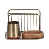 Revolutionize your organizational approach with the Kate and Laurel Koni three-piece tabletop organization set. Meticulously crafted to blend functionality with contemporary aesthetics, this set is a must-have addition to any home office or entryway space. Designed with elegance in mind, each piece showcases a harmonious fusion of walnut brown wood and sleek brass metal accents, exuding sophistication and timeless style. The metal wire rack is the perfect size to hold file folders or important work papers. Its versatile design ensures seamless integration into various environments, be it adorning your entryway or enhancing your workspace efficiency. When using it as an entryway organization set, you can showcase it as a versatile catch-all tray to hold anything from keys to change. From holding stationery essentials to corralling file folders, these supplementary pieces offer practicality without compromising on style. All nestled together, this organizational set is 12.75 inches wide by 8 inches deep with a height of 8.75 inches. Upgrade your home office organization with this exquisite set, and experience the perfect combination of modern aesthetics and practical utility.