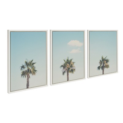 Modern Framed Canvas Wall Art Set: Palm beach art on framed high-quality gallery-wrapped canvas. Our premium high-tension canvas is stretched across a solid surface to resist sagging. Display dimensions of the larger frames are 18 inches by 24 inches, and the two smaller frames are each 14 inches by 18 inches by 1.6 inches