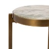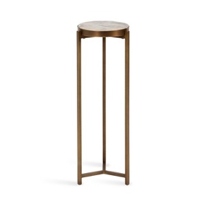 The Aguilar drink table brings refinement and sophistication to your home with its premium design. This table features a sturdy metal frame with a delightful and elegant brass finish, providing a resilient base to secure the true hero of this accent piece: its sophisticated stone tabletop. The Aguilar table has a round tabletop surface crafted from genuine Himalayan green marble, providing a precious and unmatched look that showcases the ultimate glamour in your favorite space. This drink table has a slim, compact design, with dimensions standing at 9 inches wide by 9 inches deep by 23 inches tall, making a wonderful addition to one of the smaller spaces in your home. It's also fantastic for adding a striking visual to one of the bare corners of your home! This table is ready to showcase a gorgeous candle, a small succulent, or, of course, your favorite cocktail or mixed beverage. Each Aguilar table features rubber pads attached to each of the three legs to prevent your hardwood or tile floors from becoming scuffed or damaged.