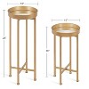The Kate And Laurel Celia Table Set gives you modern, efficient decor with a practical design made to last. Each of the side tables in this set has a glamorous gold finish, complete with a black tabletop for that modern simplicity your home deserves. With that contemporary style comes a one-of-a-kind practical design: the Celia tables fold open for a quick setup, with a magnetized tabletop for serving in seconds. This design makes it easy to store the table set when you need more room or are transitioning seasonal decor. These two tables make an excellent pair in any living room, bedroom, bathroom, entryway, or dining room. They're great as end tables by the sofa, or for jewelry and makeup next to your vanity. The Celia tables are more than your standard small accent tables: use them to serve drinks at your next get-together. Or, if you'd rather a more decorative approach, use them as displays for your keepsakes and small succulents. The taller table is 26 inches tall by 10 inches wide, and the smaller size is 20 inches tall by 10 inches wide.