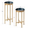 The Kate And Laurel Celia Table Set gives you modern, efficient decor with a practical design made to last. Each of the side tables in this set has a glamorous gold finish, complete with a black tabletop for that modern simplicity your home deserves. With that contemporary style comes a one-of-a-kind practical design: the Celia tables fold open for a quick setup, with a magnetized tabletop for serving in seconds. This design makes it easy to store the table set when you need more room or are transitioning seasonal decor. These two tables make an excellent pair in any living room, bedroom, bathroom, entryway, or dining room. They're great as end tables by the sofa, or for jewelry and makeup next to your vanity. The Celia tables are more than your standard small accent tables: use them to serve drinks at your next get-together. Or, if you'd rather a more decorative approach, use them as displays for your keepsakes and small succulents. The taller table is 26 inches tall by 10 inches wide, and the smaller size is 20 inches tall by 10 inches wide.