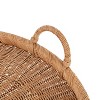 Bring modern transitional style into your home with this charming round tray with useful handles. Place this versatile natural tray on your living room ottoman or coffee table for a sizable display option. This circular tray can also be used as a decorative accent on a kitchen island to hold food on plates or on your bathroom vanity for makeup organization. Constructed completely of woven rattan, this tray is the perfect bohemian decor piece. An update to the classic accent tray, the base has a raised edge with a braided texture to keep your items more secure when transporting them. The circle tray has useful handles to easily move your items from room to room. The tray measures 22.5 inches in diameter making it a sizable option for any surface in your home. From a dining room table to a living room ottoman, this sizable tray brings tremendous versatility anywhere throughout your home. Its large size makes it great for serving snacks on little plates or as a decorative display option. Bring a decorative organic accent into your home with this charming tray.