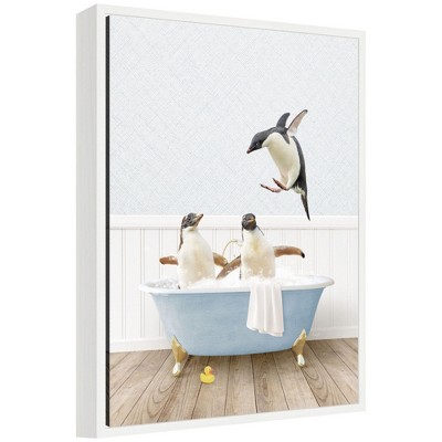 The artwork depicts an elephant sitting in a bathtub full of bubbles. There is a playful twist with a rubber duck on the floor, adding to the humor. The scene combines elements of surrealism and whimsy. This Kate and Laurel canvas art print was created by Amy Peterson and printed by Kate and Laurel in Waunakee WI. This modern floating canvas art is sure to bring joy to your space. Our design team curates art that will fit perfectly in any room of your home. Showcase this art in your living room, bedroom, home office, kitchen, bathroom, nursery, or anywhere you want to bring a little beauty and charm to your walls. Specializing in home decor, we are continually bringing timeless works of art for the traditional decorator as well as trend-forward pieces for that eclectic art lover. Our high-quality framed canvas art also makes excellent gifts for birthdays, holidays, or housewarming parties. Printed on gallery-wrapped canvas and framed with a simple gallery frame this wall art is easy to display on the wall and will match with any decor style. The outside display dimensions are 18 in x 24 in by 1.6 in Print Name: "Elephant Front in Cottage Blue Bathtub"