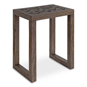 Add the boho-chic Elyria table to create a functional yet charming statement in any room. Inspired by bohemian aesthetics and modern functionality, the Elyria features an engraved tabletop that catches the eye and relishes in craftsmanship done by hand. The Elyria was handcrafted in India by skilled artisans out of a solid mango wood, giving each piece its own distinct graining and finishing. The finish on the Elyria is a rustic gray wash that blends into a variety of decorative color schemes in your home. Its overall dimensions are 20 inches wide by 14 inches deep by 26 inches tall, making it an excellent complement to your couch, armchair, bed, or entryway. Use it as a decorative catch-all for keys and household items, an area for a lamp and decorative accents, or a place to serve drinks on coasters at your next get-together. The adjustable levelers on the bottom of each leg also allow for a sturdy and size-appropriate statement for any room. Assemble the Elyria in a matter of minutes thanks to the 3-step process and straight-forward instructions included.