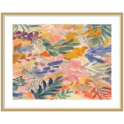 Authentic Artist Collaboration: 'Gemstones in Jewel Tones' is an officially licensed work by independent artist Leah Nadeau, thoughtfully presented in our Florence Gold molding. The finished piece measures 42 x 34, offering a sophisticated statement for your space. Visual Story: This artwork features a vibrant and colorful abstract painting with geometric shapes. The composition includes a variety of hues such as turquoise, pink, purple, and orange, creating a dynamic and textured look. The piece exudes a modern and contemporary feel with its expressive and layered elements on canvas.