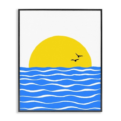 Authentic Artist Collaboration: 'Hilltop Flight Linocut Bird' is an officially licensed work by independent artist Giuliana Lazzerini Lazzerini, thoughtfully presented in our Stylish Black Narrow molding. The finished piece measures 22 x 41, offering a sophisticated statement for your space. Visual Story: This artwork features white birds in flight set against a muted blue sky. Below them are yellow, simplified tree forms resting on dark hills. A singular yellow sun or moon is visible, adding warmth to the minimalistic scene.