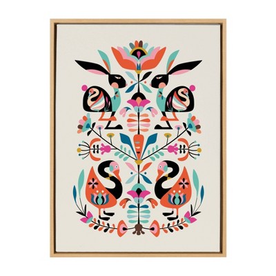 Gallery Quality Art: Measuring 22 x 22 inches, this is beautifully presented in Sylvie Natural frame - a modern, float frame with natural woodgrain coloring and dramatic depth.. Expressive Wall Art Story:This artwork features a stylized, colorful bouquet of flowers arranged symmetrically in a decorative vase. The flowers include a variety of blooms in vibrant hues of pink, red, blue, and yellow. The overall design is bold and abstract with a strong emphasis on symmetry and decorative patterns.