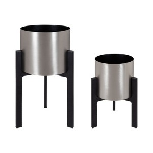 Decorate your modern home with a beautiful piece of greenery displayed in one of the Kolding modern planters. Inspired by clean, minimal design, the Kolding planter offers a freestanding design with bold and resilient iron material. The Kolding planters each have a two-tone finish, their pots utilizing a chic nickel plating and their stands having a transitional black finish. This planter's chic, two-tone finish makes it easy to blend into any room or decor theme. This set of freestanding planters have two different sizes: the larger planter is 6.75 inches wide by 6.75 inches deep by 14 inches tall, while its smaller size is 5.5 inches wide by 5.5 inches deep by 10 inches tall. These varied sizes make it easy to display the Kolding as a dynamic display or spread throughout your home for a cohesive decorative theme. Their deep pots can serve a variety of functions, too: use them to showcase a plant with the proper liner or use them as a catch-all for household necessities. Shake things up in your home by placing it near your entryway or vanity as a catch-all for keys, clutches, and more. This planter is perfect for showcasing your green thumb without sacrificing your modern or minimalist taste thanks to its simple, clean design and lightweight, quality material.
