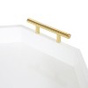 Mid-century functionality has never looked so good with the beautiful Lipton Tray from Kate and Laurel. This edition of our popular Lipton line features a glossy finish for that elegant mid-century modern edge. Its functional metal handles elevate your decorative aesthetic with a polished gold finish, drawing the line and creating a beautiful statement. This decorative tray has a radius rectangle design, with rounded edges and a total size of 18 inches long by 10 inches wide. This generous size gives you plenty of room to display small plants, store jewelry and lotions, or simply give you a place to put your media remotes. It also functions as a great serving tray, so long as you remember the coasters and plates! Modern glam design stands out in any room its placed in, but this particular tray looks spectacular in any living room, entryway, bedroom, bathroom, or kitchen. It's excellent for hardwood surfaces. too, thanks to the protective pads securely attached to the bottom to prevent scuffing.