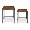 A perfectly balanced set, the Kate and Laurel Marsh 2-piece Accent Table Set are just the tables you're looking for when furnishing a bedroom, hallway or any little nook that needs some style with intention. The smart straight-lined design of the base not only creates strength but is a modern look that updates a room. The beautiful piece patterned wooden top, coupled with the contemporary look of the black base creates a lovely contemporary feel. This 2-piece set is one you can build around creating a pulled together ensemble of furniture. The Marsh end tables are perfect to use together or separately. The natural finish of the wooden top and the sophisticated distressed metal base creates a beautiful balance of character and class. The larger table is 25.5 inches tall with a 19-inch square top. The smaller table fits fully inside its base for hideaway storage if needed and is 16.75- inches square x 22-inches tall.