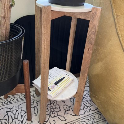 Highly recommend. Basically came assembled and just requires one screw to be placed. I am using as a plant stand. Note that this is probably not suitable for a house with children – the marble shelves simply sit on top of the wood structure, and they are not secured to the table frame at all.
