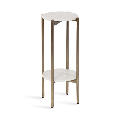 The Moxley is for the modern glam decorator that craves functionality within their aesthetically-pleasing home. This beautiful side table features two beautiful, authentic marble tabletops, which sit inside a resilient metal frame. Handcrafted in India, each Moxley table contains variations in marble veining, making each piece one-of-a-kind. Your Moxley table is an accent piece that is exclusively yours. This end table is the perfect size for flanking your entryway, bed, or couch, measuring 10.75 inches wide by 10.75 inches deep by 24.25 inches tall. Use the top marble tier as a display surface for decorative accents like a drink with coasters, succulents, an alarm clock, or candles while using the lower level to store small household items like books and more. Regardless of where and how you use this beautiful side table, you can rest easy knowing your hardwood or tile floors are protected from damage with the rubber pads attached to each foot. Finally, assemble the stunning Moxley in a matter of minutes with the streamlined 3-step assembly process.