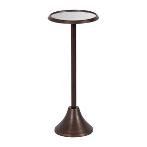 The charming Sanzo drink table makes a bold impression with its handcrafted contemporary style. The Sanzo table has a sophisticated design that draws the eye and captures guests' attention, featuring a trendy round tabletop and a bell-shaped bottom. This Sanzo table offers a dimensional, reflective surface with its mirrored tabletop. This craftsmanship creates a distinct look from piece to piece in this collection, allowing your cocktail table to be completely one-of-a-kind. The table is made from an iron material featuring an antique bronze finish on the base to provide an iconic aesthetic that echoes eras of decorative refinement. This elegant end table's overall dimensions are 9.75 inches wide by 9.75 inches deep by 23 inches tall, making it a fantastic addition to a couch, armchair, or entry. The Sanzo looks great, whether it's serving drinks on coasters, acting as a catch-all for small household items, or displaying your decorative style. The small size of this table makes it fantastic for small spaces or corners of the home. Assemble the beautiful Sanzo pedestal table in a matter of minutes with a simple two-step assembly process.