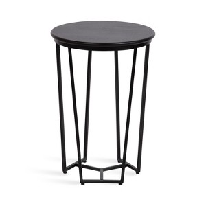 Elevate your home decor with the stunning Solvay round side table and its thoughtful design. The Solvay features a bold, geometric base that instantly provides a layer of sophistication and dimension. The tabletop is crafted from solid mango wood by artisans in India, meaning that each Solvay table is truly one-of-a-kind due to variations in the mango wood grain. Its geometric base and wood tabletop boasts an all-black finish that wows at every angle due to its modern look and dimensional design. On the adjustable feet of this unique base, the Solvay includes protective padding that keeps your hard surfaces from being damaged. This modern wonder serves as a lovely accent table throughout your home. Feature it as a living room end table or an entryway accent table. This versatile table option is built to last wherever you showcase it in your home. The overall dimensions of the Solvay side table are 24 inches tall with a 16-inch diameter, giving you a sizable table that won't overcrowd the rest of your space.