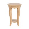 Showcase your traditional-inspired style with the Sutherlin side table from Kate and Laurel. The light and elegant finish of the table adds a touch of sophistication to any space, while the classic nature of the design adds character to your home. Between its curved cabriole legs and its wavy table apron, the unique details of this table are on full display. The light natural wood finish also lends itself to organic modern design, giving it that look of transitional, timeless decor. A careful blend of solid wood and resilient wooden material was used to create this beautiful side table, creating a statement that is as durable as it is beautiful. Its overall dimensions are 16 inches in diameter with a height of 24.25 inches, allowing the Sutherlin to function well in small corners, next to a bed, near an entryway, or paired with living room furniture. The top wooden tier is perfect for creating a lovely display area for candles, small lamps, and other accents. The bottom tier of the Sutherlin is great for storing your favorite household accessories, from small blankets to lush faux greenery. Assemble this table in only a matter of minutes with a straightforward, two-step assembly process.