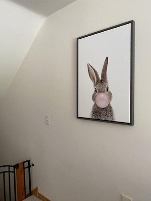 This adorable bunny's cuteness is off the charts in this fun and whimsical art print! Framed in the USA in Waunakee, Wisconsin, this floating canvas art will be a pleasure to look at every day in your living room, bedroom, nursery, or any room in the home. This art print also makes an excellent gift for birthdays, holidays, or house-warming parties. Printed on gallery-wrapped canvas and framed with a lightweight polystyrene frame, this wall art has two hangers already attached to the MDF back for easy wall display. The outer dimensions are 33 inches by 23 inches by 1.6 inches. Print Name: ?Bubble Gum Bunny?