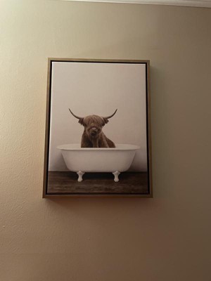 [This review was collected as part of a promotion.] Sylvie Highland Cow in Tub Color Framed Canvas by Amy Peterson Art Studio is super cute! This photo features a fuzzy and adorable Scottish Highlander Cow sitting in a vintage style bath tub. As a person who loves cows especially fuzzy cows like the Highlander and I also own a vintage tub, this is the perfect picture to hang up in one of my bathrooms in my home. I would recommend!