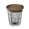 Add a new approach to household storage and upgrade your home decor with the Tenby modern nesting basket tables. These decorative end tables are designed to fit perfectly in your living room, bedroom, or home office for a functional alternative to the classic end table. The nesting tables are made with solid wood trays over a metal wire basket base for quality, minimal look. These can be used as accent tables and decorative storage baskets in the living room, tables at your bedside, or you can even add a liner to create a covered wastebasket. These metal accent tables nest one inside the other in two sizes and each of the wood tray tops is removable for ease of access. The larger size has an 11-inch diameter base, stands 19.5 inches high, and its rustic wood top has a 16-inch diameter. The smaller size has a 7-inch diameter base, stands 16.5 inches high, and its rustic wood top has a 12.5-inch diameter. These multi-functional round basket tray top accent tables ship fully assembled and are ready for display in your home.