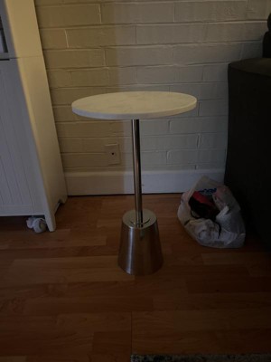 [This review was collected as part of a promotion.] The setup on this little side table was literally effortless! You attach the top and bottom to a pole and you are done! It only took 5 minutes! The marble top is super cute and minimalist. The base is a bit small but I have had no issues with it tipping! It’s perfect to lay a cup of coffee on or simply use it to display decor. The pole and base are chrome-like. The colors will go with anything! Super love this little table!