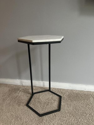 The sophistication of the Trillion C-table makes it a welcome addition to any modern decor. The Trillion C-table is crafted in India for a one-of-a-kind, custom look, making each piece truly unique. It features an authentic, premium marble tabletop and simple, resilient iron legs. The Trillion itself has a geometric design, with the marble tabletop and legs constructed with a hexagon shape. This table's overall dimensions are 16 inches wide by 14 inches deep by 27.5 inches tall, making it a fantastic addition to your living room. It looks great paired next to a sofa, by an armchair. Its large tabletop surface is fantastic for showcasing your decorative aesthetics through plants, keepsakes, photos, or other items. It's also a handy surface for media remotes, snacks, and books. The Trillion C-table is a fantastic addition to your home because of its sophisticated, premium style. This trendsetting, modern black table is ready to delight guests with its simple assembly process.