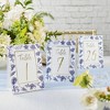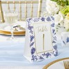 - Blue Willow Wedding Table Numbers have an arrangement of blue motifs around the outer edge with an inner gold foil border and gold foil lettering.