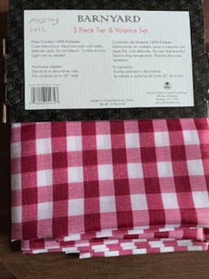 order 3 kate Aurora Country Farmhouse Barnyard Plaid Rooster Kitchen Curtain Tier &Valance set, from one of the packages was hand written missing valance. Still charge full retail. Will not order from this company again. They are willing to send partail packages and them fully knowing its a incomplete set, not cool.