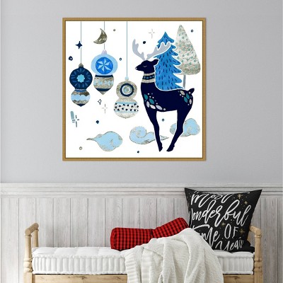 Capture the magic of winter with this framed canvas art portraying a reindeer in a blue and white snowy landscape. The frame complements the artwork's charm and adds a touch of seasonal elegance to your space. Above the fireplace and paired with a festive Christmas tree, this piece is perfect to bring the feeling of the season to your space. Framed in the USA in Waunakee, Wisconsin, this modern floating canvas art is sure to bring joy to your space. Our design team curates art that will fit perfectly in any room of your home. Showcase this art in your living room, bedroom, home office, kitchen, bathroom, nursery, or anywhere you want to bring a little beauty and charm to your walls. Specializing in home décor, we are continually bringing timeless works of art for the traditional decorator as well as trend-forward pieces for that eclectic art lover. Our high-quality framed canvas art also makes excellent gifts for birthdays, holidays, or housewarming parties. Printed on gallery-wrapped canvas and framed with a simple gallery frame this wall art is easy to display on the wall and will match with any décor style. The outer dimensions are 18 inches by 24 inches by 1.6 inches. Print Name: “Reindeer In Snow”
