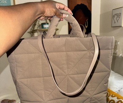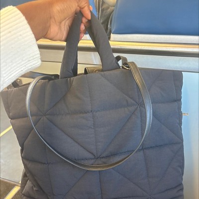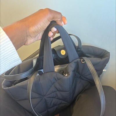 A: The handbag is made from 100% recycled nylon, offering durability and sustainability.