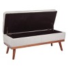 Modern retro. Update your front entry with a mid-century modern statement piece that doubles as extra home storage. This plush storage bench sets the mood as guests enter your home and offers a spot for purses, backpacks, or shoes to be placed. Modern, solid wood legs provide stability, while the hinged top allows for easy access to the storage space. Awaken your homes style with the Katheryn storage bench.