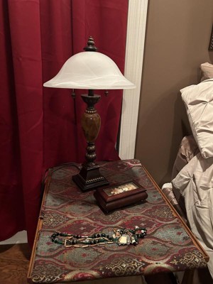 The glass shade sold me on placing two of these lamps on our stone patio end tables on our covered outdoor patio. They are easy to clean. The lamp has two light bulbs, which provides good light coverage options. The glass shade could be a longer to completely cover the light bulbs.