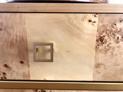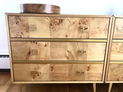 Beautiful if the squares are right. I bought 2 of these to go side by side. In the listing photos of course it looks beautiful. But you can see that it’s squares of wood. The ones I received weren’t as beautiful. One was acceptable. One had to be returned/exchanged. On a positive note it comes assembled except for the legs and handles needing to be screwed on. So don’t pay for assembly! Very heavy. Each cabinet weighs 85 pounds. Considering I got them on sale they were a great buy! Drawer interiors are a little smaller than expected. Drawers are lined in black velvet. Legs have bottom height adjusters that came in very handy.