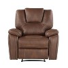 The Katrine Reclining Chair showcases the best in manual motion upholstery with this recliner that is sure to become your favorite seat in the house. The Recliner is covered in a luxurious faux-leather that features baseball stitching, padded armrests and a raised, padded headrest for a stylish and comfortable view and seat even when fully reclined. Available in Chestnut Brown or Charcoal
