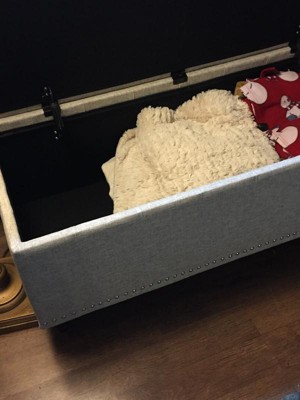This was purchased for a family room in our MN home. Intended to have a place to fold up/put away all the snuggly blankets we use when just goofing off. It's a really solid pretty piece of furniture and fits 2 queen size fleecy blankets at least. We are happy with the purchase. I think the tufting, the shaped legs, and the nail heads add a bit of style too. No real assembly required. Just screw on the legs and it's done.