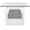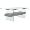 Inspired by the design of Paris' top art foundation, this modern glass coffee table makes a grand statement in any living room. Crafted almost entirely of transparent glass, a black oak finish on its single shelf lends warmth and character. Care Instructions: Dust regularly with a soft, dry cloth. Never use oiled or treated cloths on lacquered finishes. Some finishes can be wiped with a damp (not wet) cloth, followed at once by rubbing with a dry cloth to remove fingerprints and smudges. For persistent spots, gently clean with a soft cloth and a solution of water and mild soap, make sure to wipe dry. Use adhesive felt pads, coasters and placemats to protect your furniture.