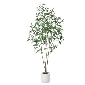 Introducing our stunning Artificial Eucalyptus Tree, the perfect addition to any home decor. This Faux Eucalyptus Tree is an exceptional replica of the real thing, accurately mimicking the delicate leaves and graceful branches of a mature Eucalyptus Tree. With its natural green hues, this Fake Eucalyptus Tree is ideal for use as indoor decor, adding a touch of nature and serenity to any room. This Artificial Eucalyptus Tree is carefully crafted from high quality, eco-friendly materials for long-lasting durability. It comes complete with a modern, white planter, providing a contemporary contrast to the organic appeal of the tree itself. Standing tall at 7 feet, this Artificial Eucalyptus Tree makes a bold statement as a centerpiece, or can be used to frame doorways or windows for an elegant touch. The Artificial Eucalyptus Tree is the perfect Housewarming Gift for friends and family, welcoming them to their new home with a lush and luxurious display of nature. Experience the beauty and serenity of the outdoors from within your home with this exquisite Faux Eucalyptus Tree. Don't settle for less when it comes to home decor - elevate your style and enrich your environment with our stunning Artificial Eucalyptus Tree.