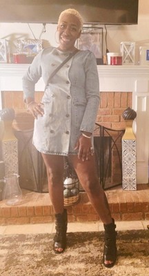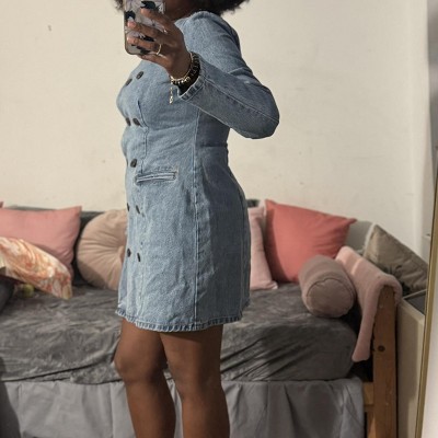 • A: The dress combines vintage wash denim with a mini length for a chic, statement-making look.