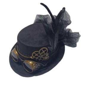 This delightful Mistress of Discovery Top Hat is an exquisite fusion of mystery, elegance, and steampunk allure. Crafted in sleek black with brass adornments, this top hat exudes an air of sophistication and intrigue. Add in the feminine touch of feathers and tulle, as well as the futuristic theme of steampunk goggles and gear adornments, this accessory becomes the perfect final piece to any charming cosplay. Whether you're attending a steampunk gathering or looking to give your classic Victorian outfit an edge, this Mistress of Discovery Top Hat will ensure a good time!