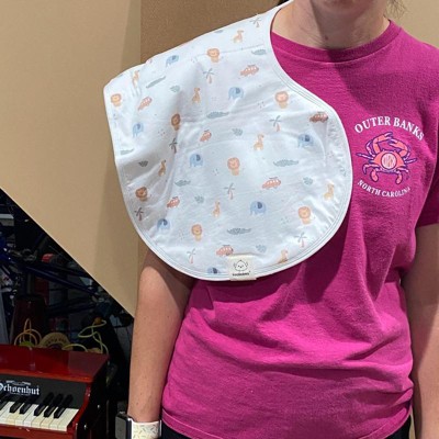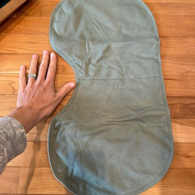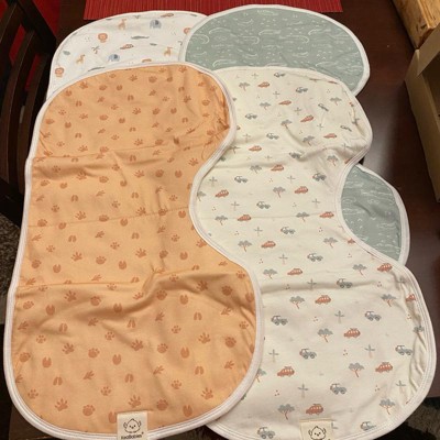 [This review was collected as part of a promotion.] Love love love these burp cloths! They are soft, yet absorbent and get the job done. I love that they are large size and bigger than some other brands. They’re large enough to have good coverage space on the front and back of your chest and back when placed over your shoulder. I also love that the U-shaped middle section contours our neck area. It’s also large enough to place under baby’s neck to burp and have the cloth cover their body, or your leg.