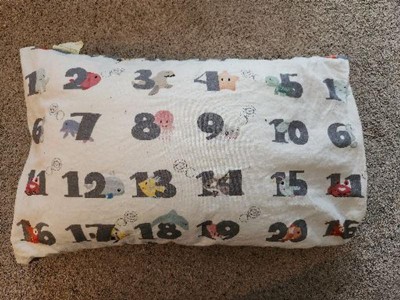 This pillow is small in size and the pillow seems like good quality. I was suprised how thick and fluffy it was. I thought I had read toddler pillows should be pretty flat. A little annoying that due to its small size that no matching sheet set pillow cases will fit it, I knew that but have noticed it bothering me more than expected! The teacher in me also hates that the numbers repeat in a line... It has 1 2 3 4 5 1 that shows. Soft but seems to collect lint.