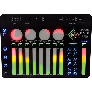 K-Mix is an all-in-one audio interface, control surface and programmable mixer that is a great space and time saver in either live or studio environments. On the input side, it features two low-noise preamps accessible through a pair of XLR/TRS combo jacks that supply 48V phantom power if needed. It additionally features six TRS line inputs for a total of eight balanced inputs. Audio and MIDI in and out can be managed via mini and micro USB. Outputs include stereo headphone output along with eight balanced ¼ in. TRS jacks (outputs 1 and 2 function in default as master stereo output left and right).One aspect that really sets the K-Mix apart are its multi-function, touch-sensitive strip faders and rotary controllers. They are satisfying to use and provide detailed input power once become accustomed to using them. They are a true joy to work with. Onboard DSP includes Compresser/Limiter, Gate, Pan, EQ and reflections emulation. It supports surround mixing for 5.1, 7.1 and Octo playback.