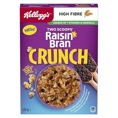 Have a bowl of get up and go with the delicious taste of Kellogg's Raisin Bran Crunch, a delicately crafted, wholesome breakfast cereal that helps bring energy to start your day. This satisfyingly crunchy cereal is made with delicious sun-ripened raisins, toasted flakes and crunchy oat clusters glazed with a touch of honey in every spoonful. Kellogg's Raisin Bran Crunch provides 6 key nutrients from real fruit and grains and a good source of fiber to help you start your day off strong; Just as nutritious as it is delicious, this cereal is heart-healthy (while many factors affect heart disease, diets low in saturated fat and cholesterol may reduce the risk of heart disease). With each spoonful, enjoy a sweet and satisfying crunch. Whether you enjoy this healthy cereal in a bowl with your favorite milk for a quick breakfast, sprinkled over yogurt for an afternoon treat, or as a snack straight from the box, Kellogg's Raisin Bran Crunch cereal lets you rise, shine, and make the most of your day.