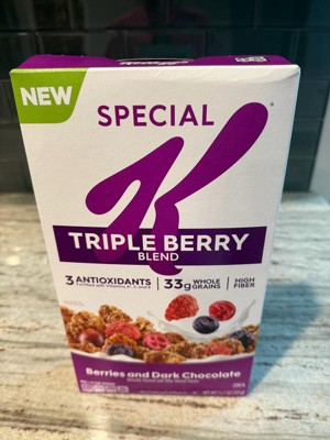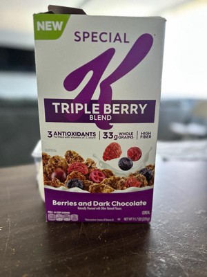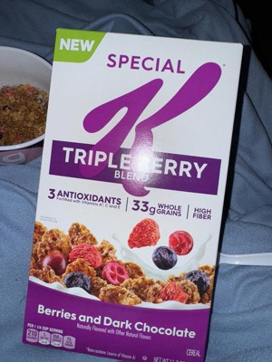 Start your day off right with the simple goodness of Kellogg's Special K Triple Berry Blend cereal, a deliciously crafted, wholesome cereal, rich in 3 antioxidants,. This cereal is made with a scrumptious blend of super food ingredients and bursting with sweet and tart cranberries, blueberries, and strawberries. Each multi-grain flake is baked to perfection with a touch of quinoa and dusted with cocoa; This cereal offers 33g whole grains, is an excellent source of fiber and 11 vitamins and minerals to help keep you going strong. Take a deliciously satisfying meal or snack with you wherever you go. Whether you enjoy your cereal at home, work, school or the gym, you'll love the satisfying taste. Kids and adults both love the taste of real berries and dark chocolate flavor paired with your favorite milk. Go ahead, pop open the box, pour over ice-cold milk, and enjoy Kellogg's Special K Triple Berry Blend cereal that lets you feed your strength with each irresistible bite.