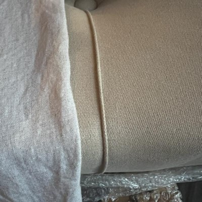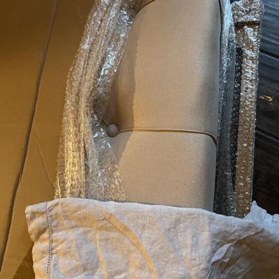 Very disappointed. This is not true linen material at all like it says in the title and description. It is more like a shiny thin polyester or thin t-shirt material. Will be returning. Photos are hard to capture the exact texture and shininess so I tried comparing it to a linen (wrinkled, lol) napkin. Close up it looks good but far away it looks like fake “linen.” Otherwise the wood color matches the online photos but the fabric isn’t what I wanted. Extremely firm but it feels like it could snag very easily also.