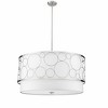 A sophisticated touch to spacious interiors like dining rooms and open concept living rooms, this modern five-light pendant boasts a tiered drum shape design that offers both style and grace. Open ringlets compress against one another to create an outer cage, elevated by a shiny brushed nickel finish. Behind it, a white fabric shade puts off a serene, captivating glow, casting a gorgeous silhouette across the space.